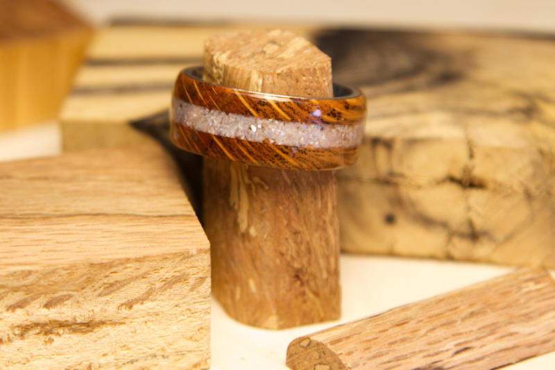 Locally sourced laurel oak ring with crushed shell inlay. I had not idea this ring would turn out so nice. It was scrap from another project. The foreground blocks (on both left and right) and the block holding the ring are laurel oak. As you can see, applying the finish really makes the difference and brought this piece to life!