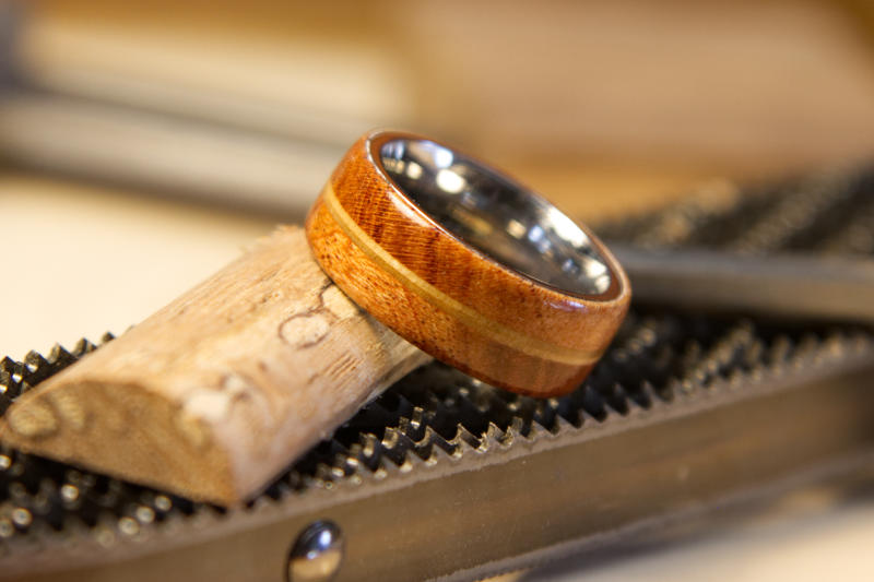Cherry wood laminated with a veneer in the center. I’m not quite sure what the veneer is seeing it came in an assortment package with no labeling. The color matches the cherry wood nicely. It looks like there are two colors of veneers in the center, however, that is actually the layering the grain in different directions.