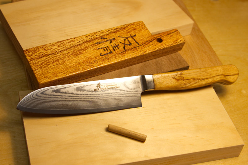 This is a Japanese style chef knife I made as a Christmas gift. The blade is a 67-layer Japanese steal blade made by Zhen that I purchased. I created the handle out of spalted tamarind. The knife had only a packaging sheath with it, so I researched traditional Japanese sheaths and created one in the style out of a unique piece of laurel oak I had in my shop. Handle and sheath are finished to be food safe. The blade I sharpened to 17 degrees (traditional for Asian blades) and is razor sharp!