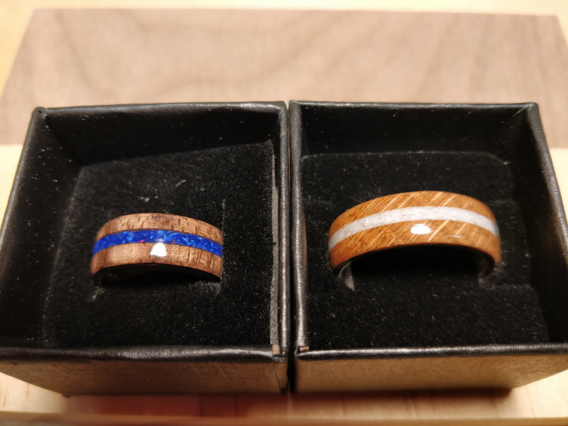 Two commissioned rings all set and ready to go to their new homes. One is black walnut with blue sand inlay and the other is laurel oak with a mother of pearl inlay.