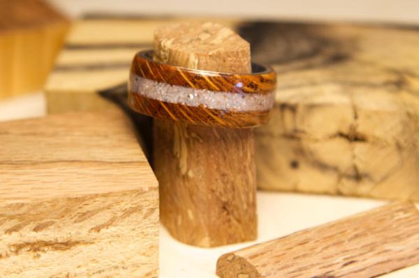 Two commissioned rings all set and ready to go to their new homes. One is black walnut with blue sand inlay and the other is laurel oak with a mother of pearl inlay.